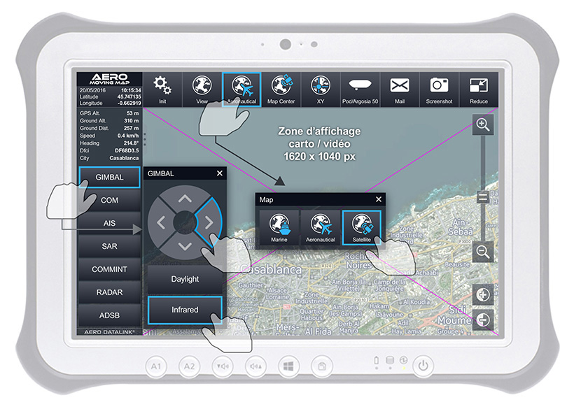 Overhaul of the interface and HMI design of the Aero Moving Map mapping software. Intended for a surveillance system embarked in light aircrafts with an interface per tactile tablet and its declination on a fixed station on the ground.